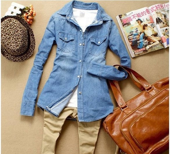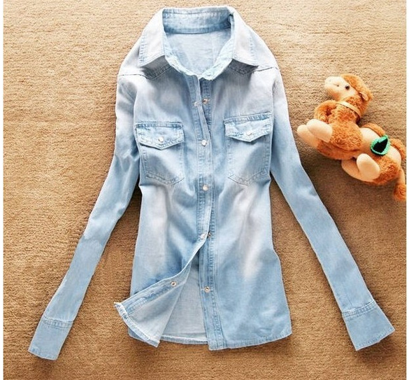Stylish Cotton Blend Long Sleeve Denim Button up top. Available in Blue and Light Blue. See Chart for Size and Measurements.